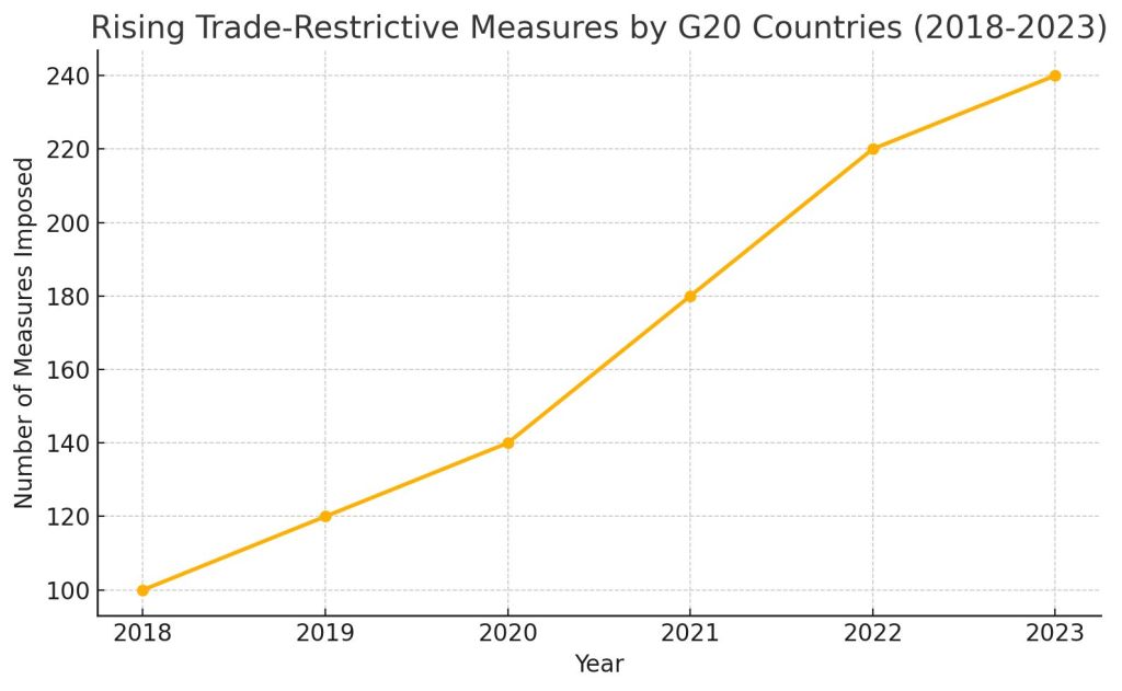 This trend has been visible through rising tariffs and protectionist policies among major economies. For instance, between 2020 and 2023, the number of trade-restrictive measures imposed by G20 countries increased by nearly 70%, according to data from the World Trade Organization (WTO). These measures include higher import duties, export bans on critical raw materials, and the reshoring of strategic manufacturing sectors.