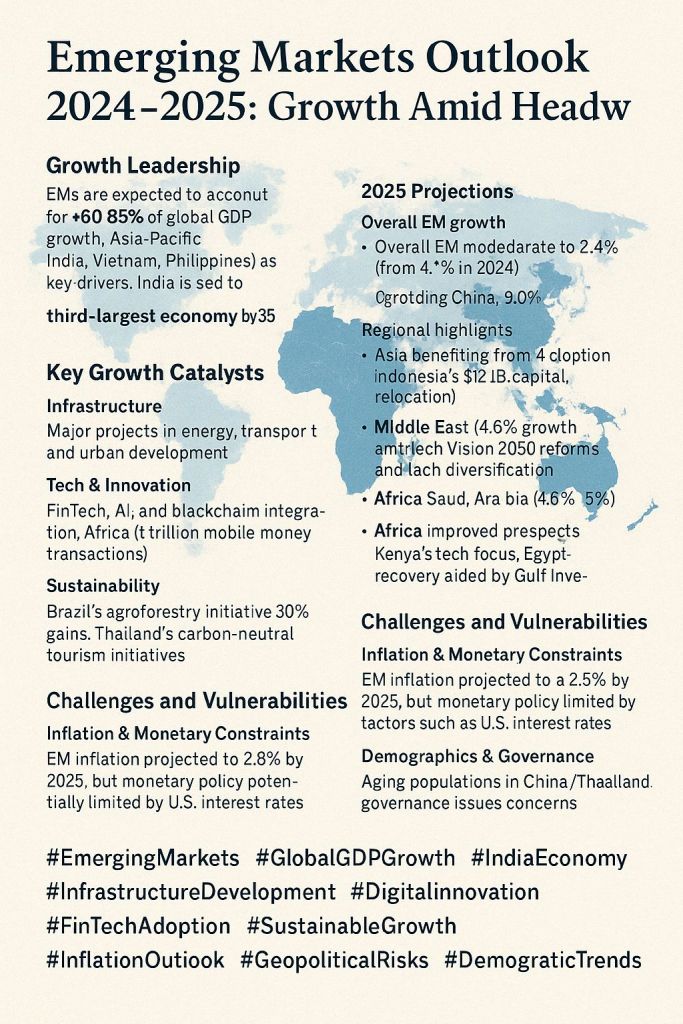 In an increasingly uncertain global economy, emerging market economies (EMs) continue to shine as dynamic engines of growth. With developed economies facing stagnation, it is the EMs—particularly in Asia, Latin America, the Middle East, and Africa—that are expected to account for nearly 60–65% of global GDP growth over the next two years. These projections are rooted in a combination of structural reforms, infrastructure-led development, and digital innovation.