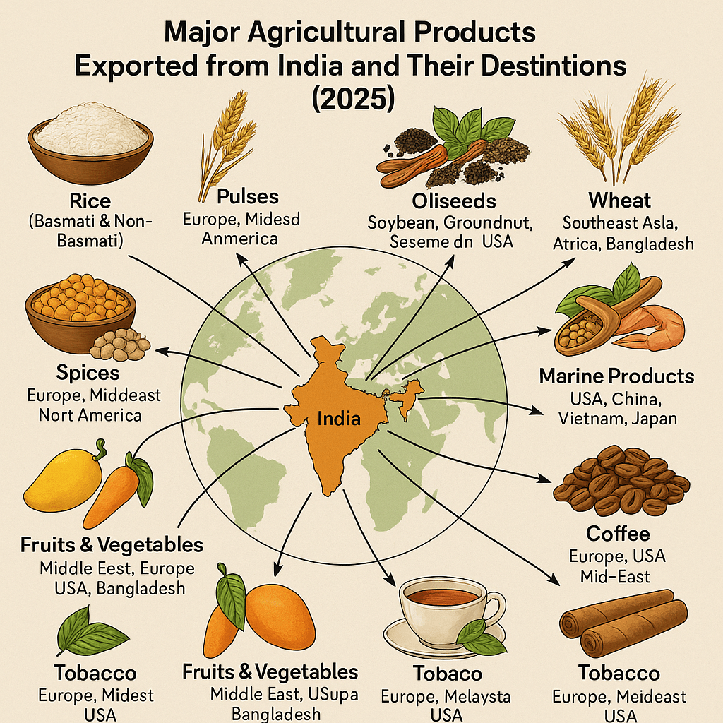 India’s agricultural export landscape continues to showcase its strength as a global agri-trade powerhouse. As of 2025, Indian agri-products are reaching an impressive array of destinations worldwide, a reflection of both India’s natural agro-climatic diversity and its expanding trade relationships. This blog presents a product-wise breakdown of major Indian agricultural exports and their top international markets,