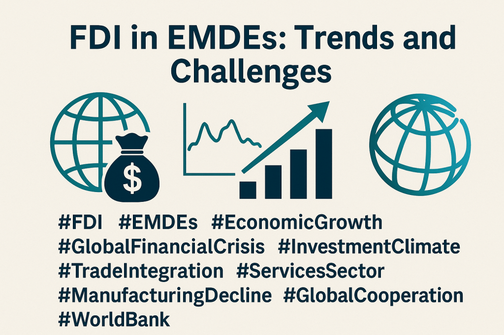 Foreign direct investment (FDI) inflows to emerging market and developing economies (EMDEs) have been on a steady decline as a share of GDP since the global financial crisis. In the boom years of the 2000s, FDI inflows reached nearly 5% of GDP in a typical EMDE by 2008. Today, they hover around 2%—the lowest since 2005. In 2023, EMDEs received $435 billion in FDI, reflecting a broad-based slowdown across regions and sectors.