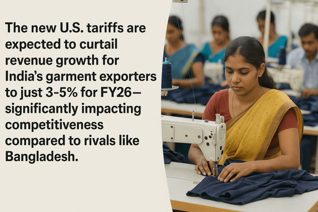India’s ready-made garments (RMG) sector—long a vital contributor to export earnings and employment—is bracing for a sharp slowdown. According to a recent forecast by Crisil, revenue growth is expected to shrink to just 3–5% in FY26, nearly halving from previous levels. The primary reason: new U.S. tariffs that are set to dent India’s price competitiveness in its largest apparel market.