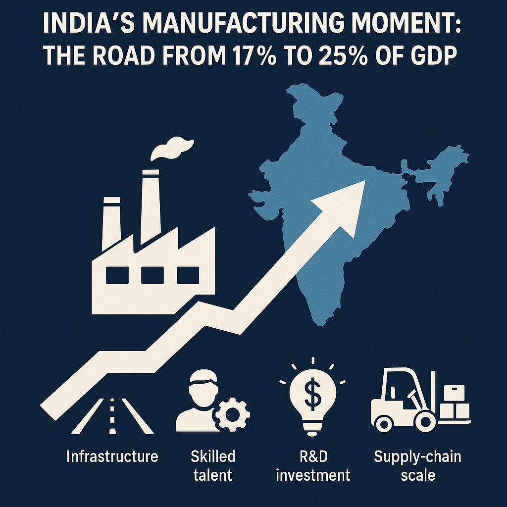 India’s ambition to make manufacturing 25% of GDP is not just a numerical goal—it’s a defining challenge of national capability. The world is rebalancing supply chains, and India’s demographic advantage, strategic location, and policy alignment present a once-in-a-century opening.