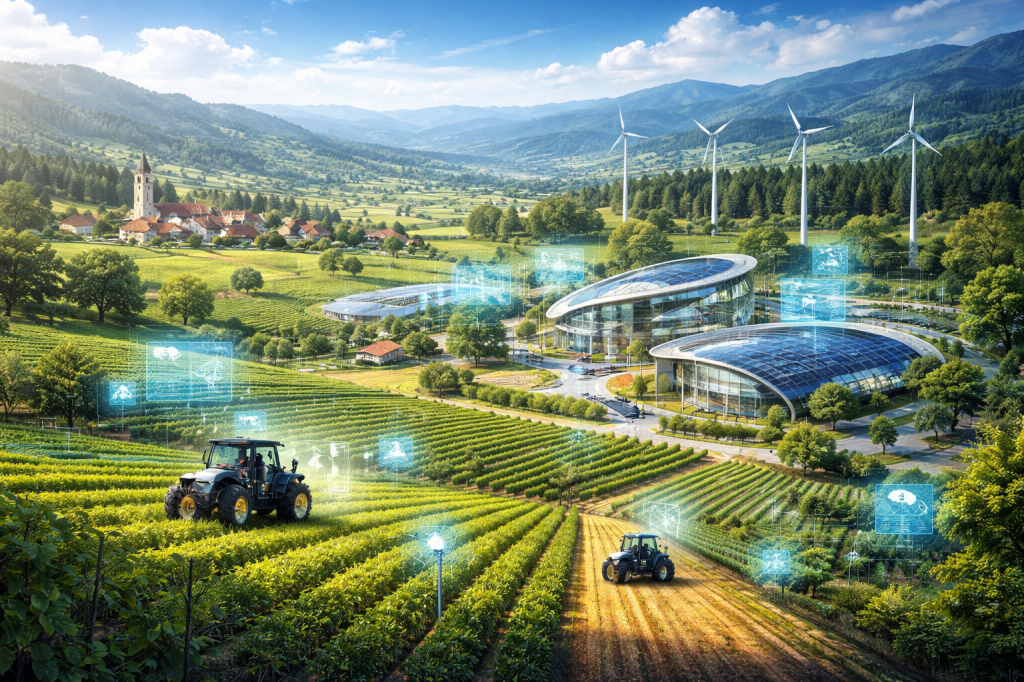 Looking ahead, Futuristic Pathways for Rural Clusters indicate a move toward AI-orchestrated production networks, autonomous farm equipment, bio-digital innovations, and climate-smart industrial estates. Europe anticipates that by 2035, rural digitalisation could contribute an additional €180–€210 billion to the EU economy, and Slovenia’s ITC Cluster is positioned as a leading example of this shift. The future will belong to rural clusters that move from traditional supply chains to intelligent value webs, where data flows as seamlessly as physical goods.