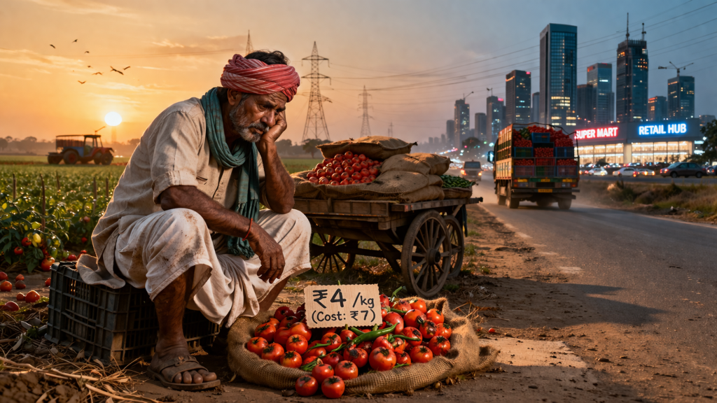 #FarmersCrisis #PriceDiscovery #AgriculturalEconomics #MarketFailure #SupplyChainInefficiency #Perishability #MSP #RuralDistress #ValueChainInequality #AgriReforms